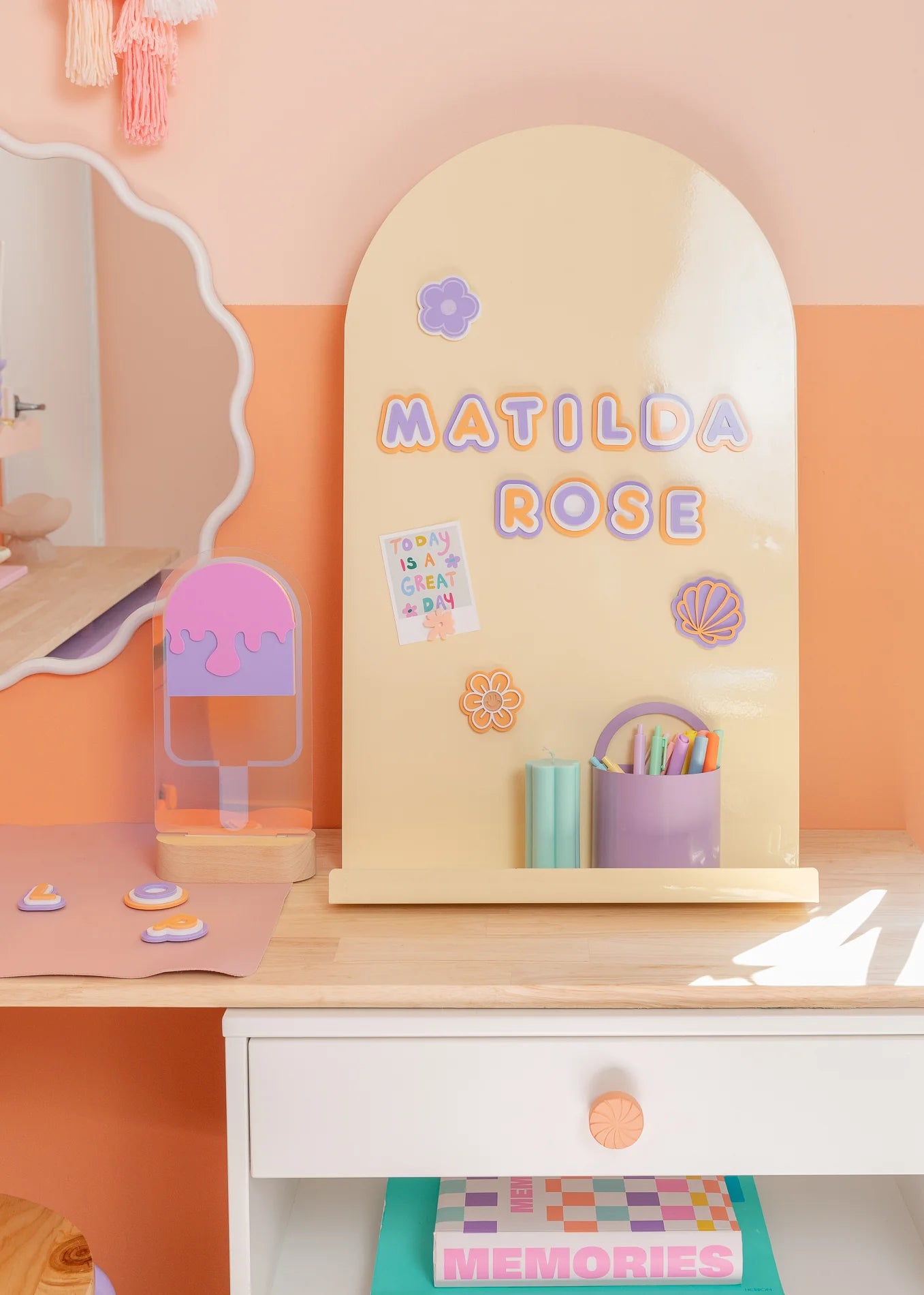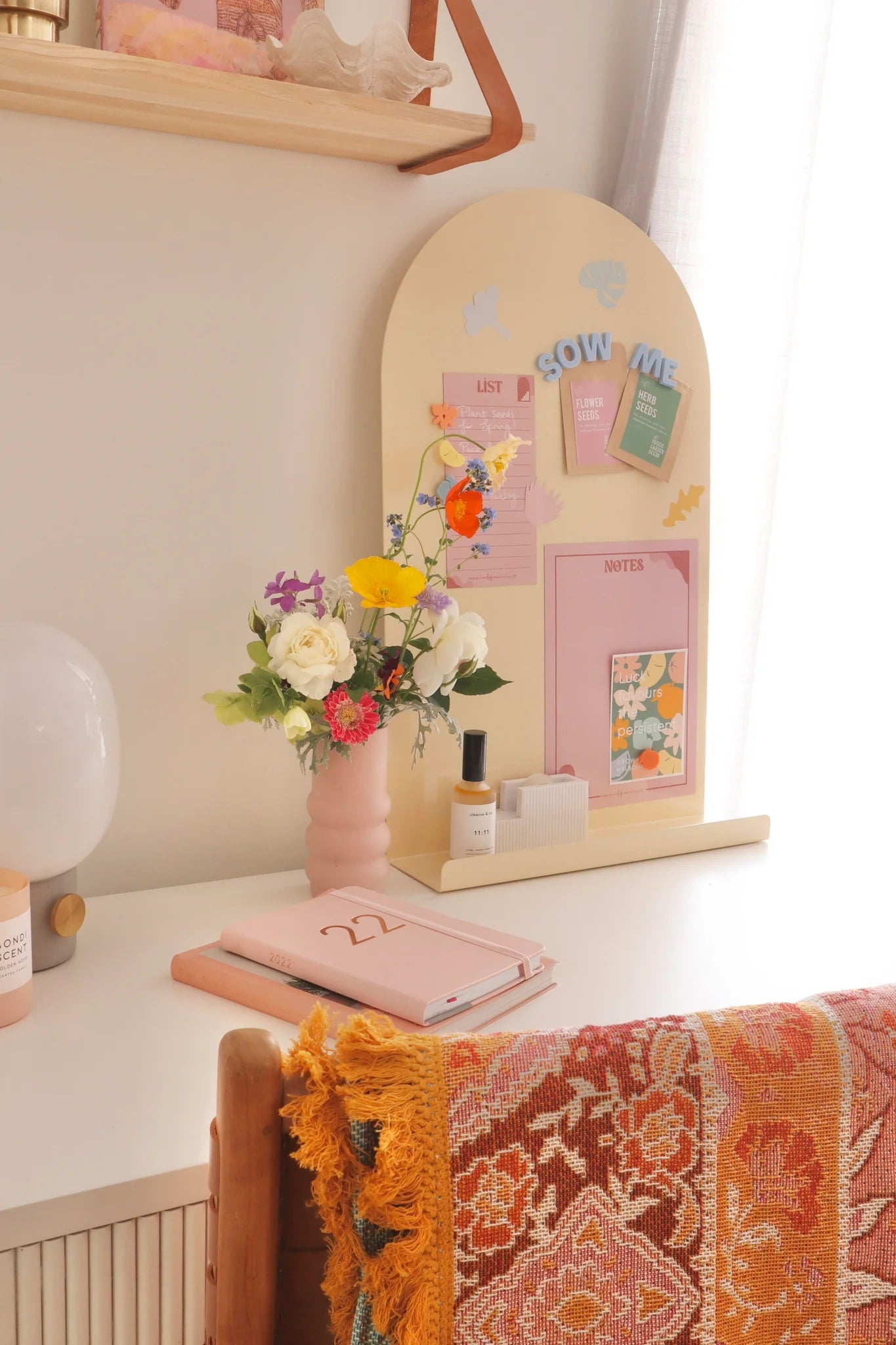 Transformable: Customize your Moodyboard by adding our arched mirror attachment to turn it into a vanity piece.